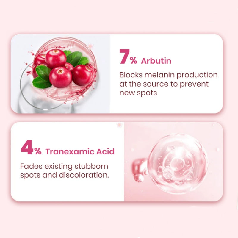 A formula legfontosabb összetevői: 7% arbutin + 4% tranexámsav (TXA) + glutation