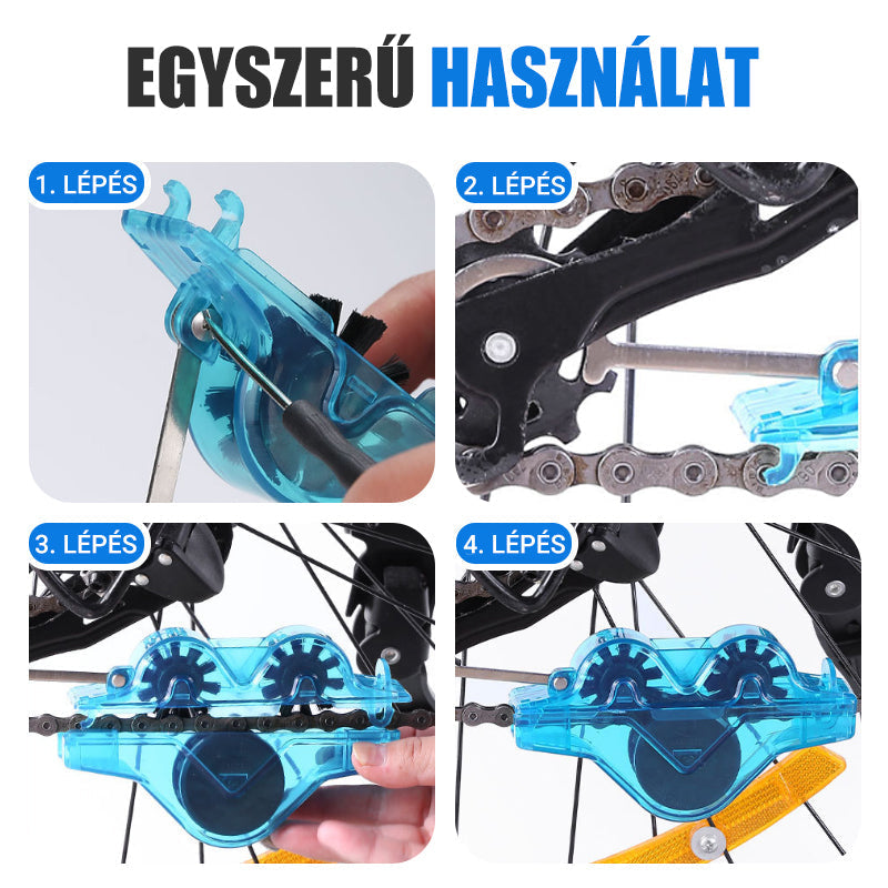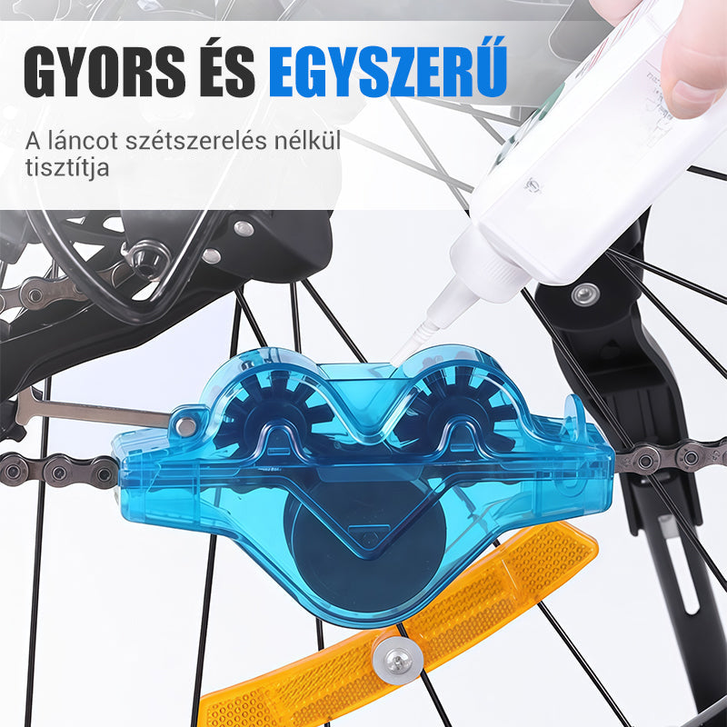 Egyszerűen rögzítse a tisztítót a láncra, töltse be a tisztítószert, és forgassa meg a pedált. A láncot nem kell leszerelni – élvezze a gyors és tiszta karbantartást.