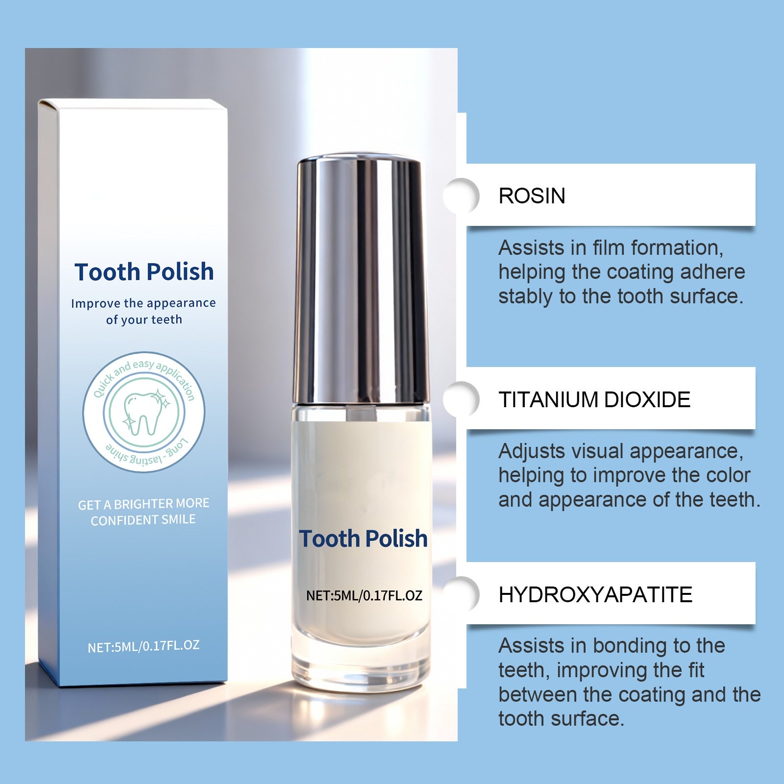 Ez a fogfehérítő hidroxiapatitot és titán-dioxidot tartalmaz, amelyek nemcsak javítják a színt, hanem biztosítják a bevonat és a fogfelület közötti erős kötést is, garantálva az egyenletes és tartós fényt.