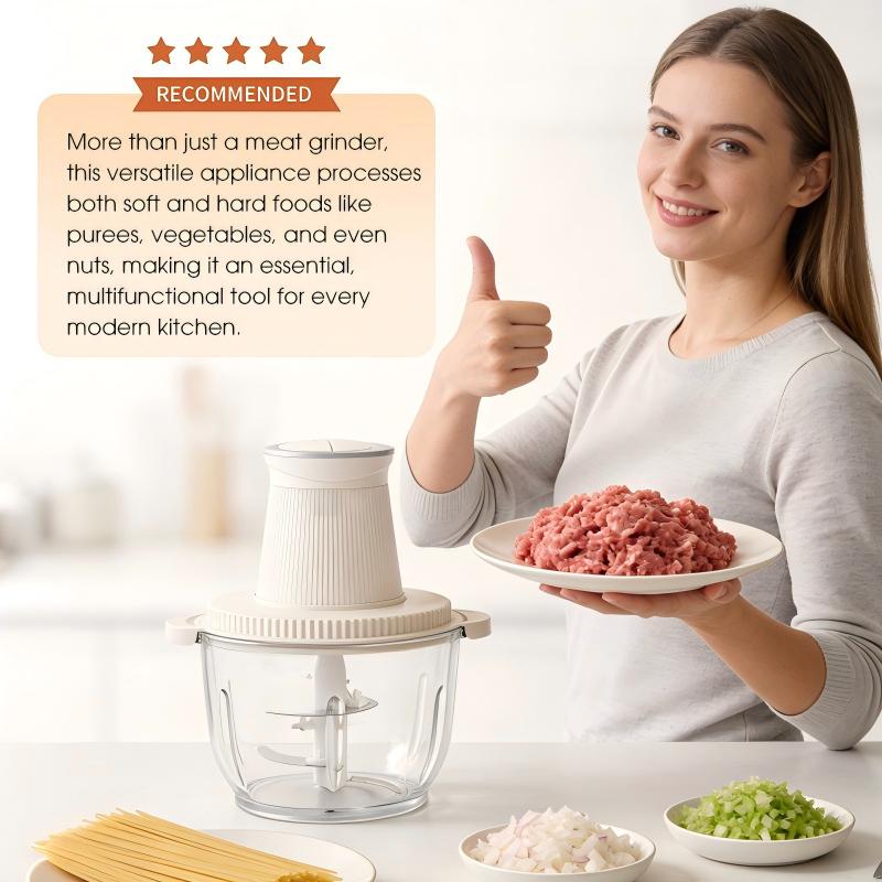 Ez nem csak egy húsdaráló, hanem egy sokoldalú készülék, amely puha és kemény ételeket egyaránt feldolgoz, például püréket, zöldségeket és még dióféléket is, így elengedhetetlen, többfunkciós eszközzé válik minden modern konyhában.