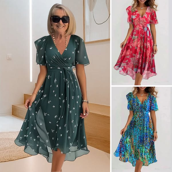 Különleges kék rövid ujjú midi ruhánk, csábító V - nyakával, finom virágos nyomatokkal és lobogó ujjakkal, a ruhatár alapdarabja.🌸