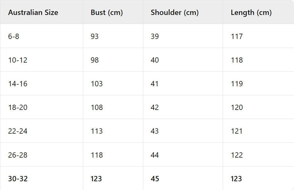 | International Size | Australian Size | Bust (cm) | Shoulder (cm) | Length (cm) |